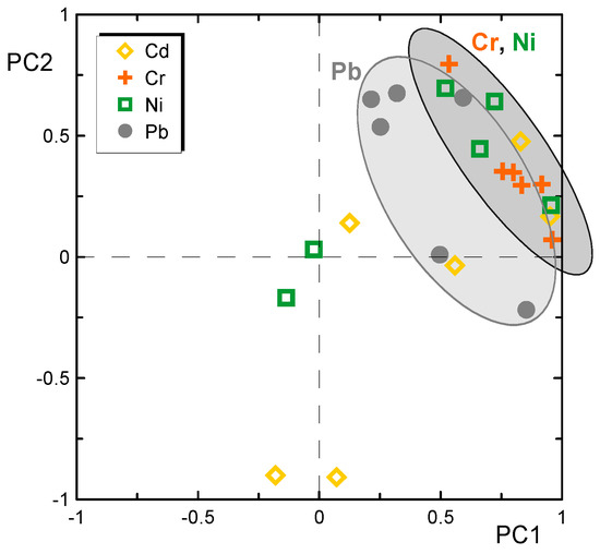 Figure 7 shows the data obtained for PCA analysis, PC1 vs. PC2. The grouping of sites with a high correlation in Cr, Ni and Pb concentrations is evident. These sites are located at the entrances to the city, establishing a clear link between the levels of these metals in the soil and vehicle traffic. In addition to those locations, the city center and the urban highway are also part of this set. The third factor (PC3), a factor that explains only a small variance of the global system, may explain the conjoint variation of Pb and Ni in the city entrances and in the urban highway.
