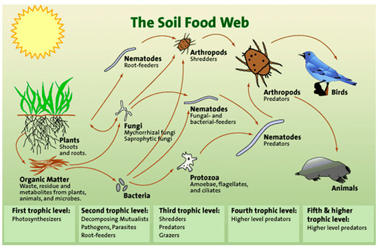 An open access USDA/NRCS illustration of the five trophic levels of the soil food web and the role of nematodes in trophic levels II, III, and IV. https://www.nrcs.usda.gov/wps/portal/nrcs/photogallery/soils/health/biology/gallery/?cid = 1788&position = Promo (accessed on 5 May 2021).