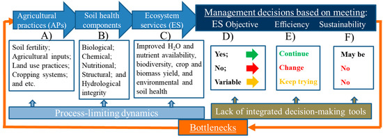 Key concepts in crop production management: (A) agricultural practices (APs) collectively influence, (B) soil health components to generate (C) objective-dependent ecosystem services (ES) outcomes, that (D) may be achieved (yes) or not achieved (no) or variably achieved, which lead to management decisions on (E) efficiency and (F) sustainability of the outcomes, and the bottlenecks in the gaps in integrated understanding of the process-limiting dynamics across A, B, and C, and the lack of decision-making tools across D, E, and F, that keep the cycle of soil health degradation continue.