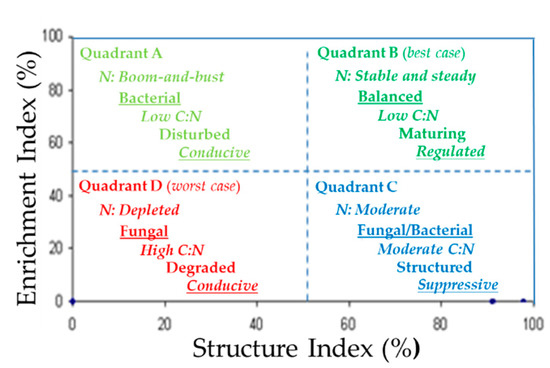 Simplified SFW model that uses changes in nematode community relative to food and reproduction (Enrichment Index, y-axis) and resistance to disturbance (Structure Index, x-axis) to describe soil health conditions from best (Quadrant B) to worst (Quadrant D) case scenarios for nutrient cycling and agroecosystem and sustainability [34]; Indices of Ecosystem Condition (ucdavis.edu).