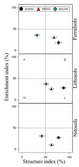 Soil food web structure of Ferralsols, Lithosols, and Nitosols under disturbed (right) fields of Ghana (circle), Kenya (triangle), and Malawi (square). The Quadrants A, (enriched but unstructured), B (enriched and structured), C (resource-limited and structured), and D (resource-depleted with minimal structure) are based on the Ferris et al. [34] model. Adopted from Melakeberhan et al. [84].