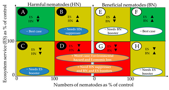 The assessments use quadrant formats to relate integrated efficiency in terms of soil nutrients in relation to the abundances of either harmful or beneficial nematodes expressed as a percentage of those of the untreated control. Plotting the changes in ecosystem service (crop yield or soil nutrient, etc., y-axis, Equation (6)) parameters against the changes in nematode abundances (x-axis, Equation (4) or (5)) provide two sets of graphical indicators of the condition of the production system (Quadrants A-D–assessment of harmful nematodes, Equation (4) and Quadrants E-H–assessment of beneficial nematodes, Equation (5) (Figure 5)). By visualizing the data this way, the FUE model identifies best-to-worst case scenarios for generating desirable ecosystem services while simultaneously meeting environmental and economic expectations (Figure 5). Best case scenarios are where treatments result in a desirable ecosystem service increase and a decrease in harmful nematodes (Quadrant A) and an increase in beneficial (Quadrant F) nematodes. For best cases, treatment can continue as usual. In cases where ecosystem service increases and harmful nematodes increase also (Quadrant B), treatments that suppress harmful nematodes are needed. In cases where ecosystem service increases but beneficial nematodes decrease (Quadrant E), treatments that increase beneficial nematodes are needed. In cases where ecosystem service decreases and root-feeding nematodes decrease (Quadrant C), treatments that increase ecosystem service are needed. In cases where ecosystem service decreases and beneficial nematodes increase (Quadrant H), treatments increase ecosystem service ae needed. The worst-case scenarios, and probably involving economic loss, environmental hazard, and loss of biodiversity, are where desirable ecosystem service decreases with an increase in harmful nematodes (Quadrant D) and a decrease in beneficial nematodes (Quadrant G). Here, treatments that increase ecosystem services and beneficial nematodes, and that suppress harmful nematodes, are needed.