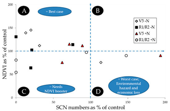 Means of SCN population density (eggs/100 cc of soil) and NDVI for levels of fertilization (control, -N or +N) at vegetative (V5) and reproductive (R1-R2) growth stages of soybean expressed as measured values (left) and as percent of control (right), and the interactions of nutrient (Nu) and time (T). Adopted from Melakeberhan [30].