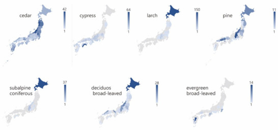 Forest types and their predominant tree species in Japan.