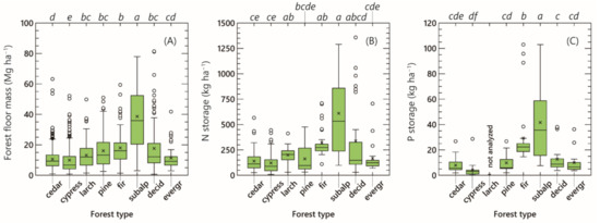 Box and whisker plots of forest floor mass (A), nitrogen (B), and phosphorus (C) storage in the forest floor among Japanese forest types. Subalpine coniferous forests, deciduous broad-leaved forests, and evergreen broad-leaved forests are represented by “subalp”, “decid”, and “evergr” respectively. The box covers the 75th and 25th percentiles. The horizontal line within the box marks the median, and the cross indicates the mean. The length of the whisker is 1.5 times the interquartile range. Outliers are indicated by open circles. Different lowercase letters on the figure denote significant differences between forest types at p < 0.05 based on the Steel–Dwass test.
