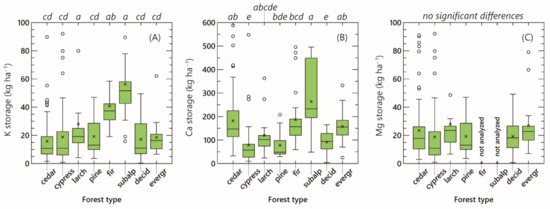 Box and whisker plots of potassium (A), calcium (B), and magnesium (C) storage in the forest floor among Japanese forest types. The definitions of box and whisker are the same as those used in Figure 2. Different lowercase letters on the figure denote significant differences between forest types at p < 0.05 based on the Steel–Dwass test.