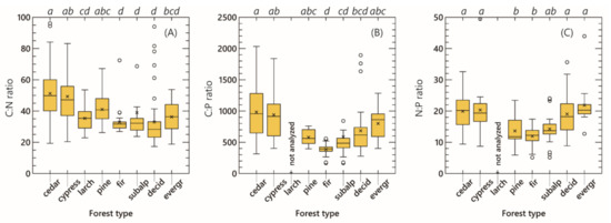 Box and whisker plots of stoichiometry (C:N (A), C:P (B), and N:P (C) ratios) of the forest floor among Japanese forest types. The definitions of box and whisker are the same as those used in Figure 2. Different lowercase letters on the figure denote significant differences between forest types at p < 0.05 by the Steel–Dwass test.