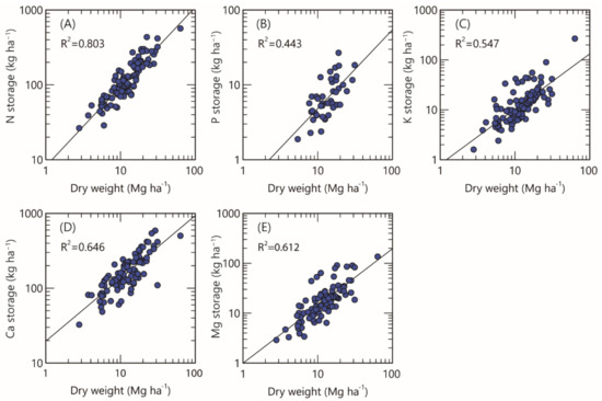 Relationship between nutrient storage (nitrogen (A), phosphorus (B), potassium (C), calcium (D), and magnesium (E)) and dry weight of the forest floor in deciduous broad-leaved forests in Japan. Regression equations are shown in Table A1.