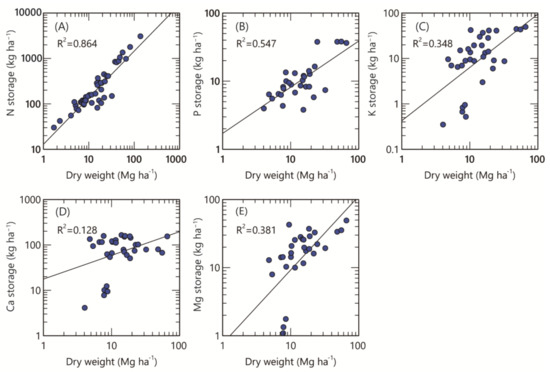 Relationship between nutrient storage (nitrogen (A), phosphorus (B), potassium (C), calcium (D), and magnesium (E)) and dry weight of the forest floor in Japanese cedar plantations. Regression equations are shown in Table A1.