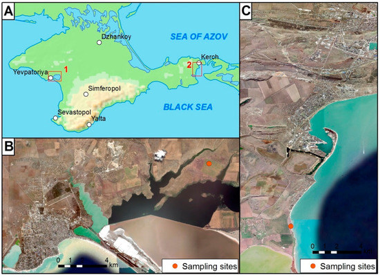Study area: the first site (15 km north-east of the ancient town of Kerkinitis) and second site (16 km south the ancient town of Bosporos, near the Geroevka-2 settlement) (A), soil sampling location on the first site (B), soil sampling location on the second site (C). Satellite imagery mosaic source—ESRI World Imagery.