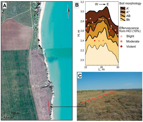 The second site is located 16 km south of Kerch (near the Geroevka-2 settlement). The Geroevka-2 settlement is located 3 km from the antique city of Nympheus and occupies an area of about 4 hectares in terms of the distribution of the cultural layer [20]. Its residential, economic, and burial complexes belong to four chronological periods: antique (the turn of the 6th–5th centuries BC, 2nd and 3rd quarters of the 4th century BC) and early medieval (4th–6th and 8th–9th centuries AD). As the artefacts (dated pottery fragments) are multi-layered, the rampart fence, which is functionally connected to them, could be created in a wide chronological range. The method of pedogenetic chronology was used for dating the rampart by the thickness of horizons A + AB at its top. This area is presently not ploughed up and is covered with natural steppe vegetation. Thus, it represents postagrogenic fallow land. The length of each transect was 140 m. The distance between the transects was 30 m, and the distance between sampling points along the transect varied from 15 to 20 m. As per satellite images, the surviving length of the boundary rampart is 233 m, and its width varies from 3 to 7 m.