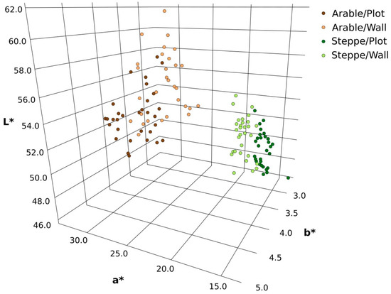 If the samples are compared by dividing them into two groups (arable land and steppe), then all colour coordinates of the samples collected on the arable land are, on average, higher than those of the samples from the steppe (Table 2, Figure 4). The arable soil is lighter (the L* coordinate is higher), redder (the a* coordinate is higher), and more yellow (the b* coordinate is higher).