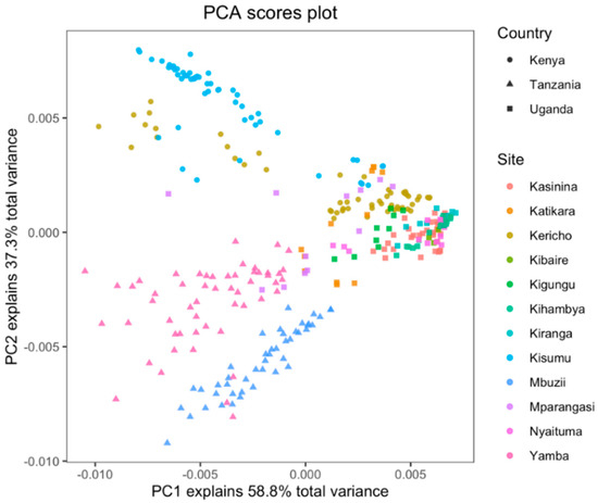 The PCA similarity maps of PC1 and PC2 made using the raw spectra show a clustering of soil samples among the spectra from various sampling counties in Kenya, Uganda and Tanzania (Figure 1). Further, there is a clear overlap of various spectra from sampling sites in Uganda. The clustering of soil samples could explain the effect of geographical origin of soil samples on NIR spectroscopy analysis when assessing both physical and chemical soil properties. Soil samples from the Mbuzii area in Tanzania were grouped away from Yamba soils samples using PC1, indicating that the largest contribution to variance in soil characteristics from Tanzania could be from these two regions from which the soil samples were taken. Although the Kenyan soil samples could not be discriminated using PC1, the samples were grouped separately according to the sampling site in PC2. There was no distinguishable variation profile amongst soil samples from Uganda to discriminate different sampling sites (Figure 1). These findings show that the primary sources of spectral variance are differences in soil types and that PCA may be used to distinguish sites but not land-use type.