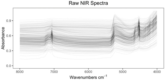 The spectra of all soils were similar in shape, with strong absorbance’s around 5200 cm−1 and three distinct absorption peaks (at roughly 7060 cm−1, 5200 cm−1, and 4520 cm−1) (Figure 2). The NIR raw spectral signature of scanned soil samples ranged from 8000 cm−1 to 4000 cm−1 regions. The NIR spectra reveal details of diverse soil constituents, including organic and inorganic components [2]. The band near 7060 cm−1 is caused by the overlapping of the first overtone of the O-H stretching vibration associated with water and hydroxyl groups in clay [2]. The band near 5200 cm−1 is related to the H-O-H bend and O-H stretch combination bands in water, while the band at around 4520 cm−1, usually associated with clay minerals, results from metal–OH bending plus O-H stretching. Based on the recorded NIR spectra, the identified spectral regions and the vibrational groups are relevant in the generation of calibration models, the overtones of O-H and H-O-H stretch vibrations of free water, and the overtones and combinations of O-H stretching and metal-OH bends in the clay lattice, and are related to the well-defined absorption patterns in soil reflectance across the NIR [35]. NIR spectra with this shape have been recorded for a variety of soils [36,37].