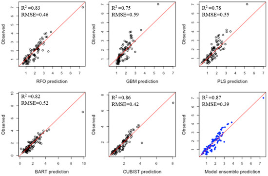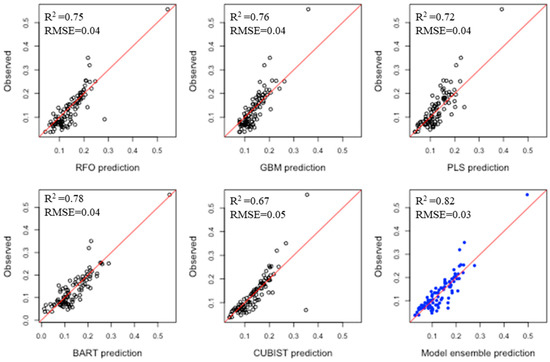 Ensemble modeling, unlike traditional single modeling methods, establishes many “weak” models then aggregates the predict results of each “weak” model through weighted average methods. In this study, we used regression modeling of the total ensemble algorithm plus other five machine learning algorithms, random forest optimization (RFO), gradient boosted machines (GBM), partial least squares (PLS), Bayesian additive regression trees (BART) and Cubist, to model the physical and chemical characteristics of soil. Using these modeling techniques, the processed spectral data were linked to laboratory-measured soil property data. RFO trains each tree separately using random sampling of the data, while GBM is a hybrid method that incorporates both boosting and bagging approaches [28]. BART is a nonparametric Bayesian regression method that employs dimensionally adaptable random basis elements to make inferences and estimate an unknown regression function [29], while the Cubist model includes boosting with training committees (typically more than one), which is comparable to the approach of “boosting” by generating a sequence of trees with successively adjusted weights [30].