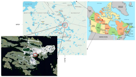 Two study sites were located at Diavik Diamond Mine (64°24′46″ N, 110°16′24″ W), approximately 320 km northeast of Yellowknife, Northwest Territories, Canada, in the sub-Arctic tundra on the Precambrian Shield (Figure 1). The area is characterized by short and cool summers, long and cold winters, and continuous permafrost. The mean annual temperature is −9.3 °C, with the coldest in January at −27.2 °C and warmest in July at 13.2 °C. Permafrost ranges from 1 m in wet areas to 5 m in bedrock. Mean annual precipitation is 305.8 mm, with 169.5 mm snow and 136.3 mm rain. The study area consists mainly of massive Archean rocks that form outcrops and glacial deposits of boulders, till, and eskers. The landscape of the site is characterized by steep-sided bedrock outcrops, undulating to strongly rolling morainal deposits, ridged and hummocky glaciofluvial deposits, and level to depressional glaciolacustrine and organic deposits [25]. Soils in the area are typically classified as turbic and static cryosols. The area is a transition between taiga forest and Arctic tundra vegetation. Vegetation in upland areas is dominated by dwarf shrubs and is generally sparse and stunted. Sedges and mosses dominate in low-lying wet tundra.