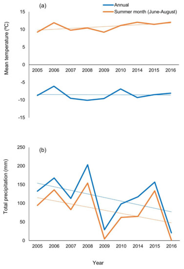 Mean air temperature changed little from year to year, with the highest recorded in 2006 and the lowest in 2008 (Figure 2a). Summer temperatures from June to August increased from 2005 to 2016, with the highest in 2006 and lowest in 2009. Mean annual and summer precipitation declined from 2005 to 2016, with the highest in 2008 and lowest in 2016 (Figure 2b).