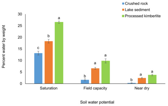 The highest water retention and contents in processed kimberlite substrate with or without topsoil support the results of other studies associated with diamond mine reclamation in the Arctic [18,23]. Other studies reported that processed kimberlite was less limited by low water content, as it retains more water than crushed rock and lake sediment due to its lack of coarse material [8,28]. This would be affected by the finer texture of processed kimberlite particles (under 2 mm), which can easily hold more water than coarser textured lake sediment and crushed rock. At saturation, processed kimberlite held ~27% water by weight, with the highest water retention of the three substrates. Fine-textured lakebed sediment, with likely greater pore space and surface area, had higher water retention than crushed rock [18]. Miller and Naeth [18] found greater water retention in processed kimberlite relative to crushed rock and lakebed sediment was due to its composition of particles under 2 mm. Soil texture can influence water retention, and predominantly coarse-textured soils typically have high infiltration rates and saturated hydraulic conductivity, and low water holding capacity [29]. Several other studies found coarse-textured mine wastes were characterized by lower soil water contents and nutrient retention capacities [11,15,23].