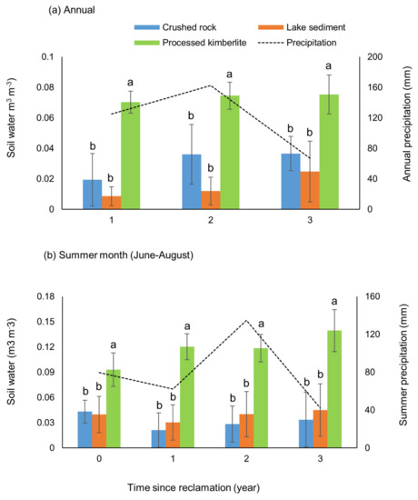 Substrates did not show any significant treatment × year (interaction) effect for mean annual water content, although a significant treatment (substrate) (annual mean p < 0.001) effect was observed. Processed kimberlite had significantly greater water content than crushed rock and lake sediment (Figure 4a). June-to-August water content showed similar trends, i.e., it was over twice as high in processed kimberlite than in lake sediment and crushed rock, with an increasing trend over time (Figure 4b). Mean annual temperature did not significantly differ among substrates, with the highest values in crushed rock, followed by lake sediment and processed kimberlite (Figure 5a). Unlike mean annual temperature, summer temperatures slightly differed among substrates, with its highest in processed kimberlite in most seasons, followed by lake sediment and crushed rock (Figure 5b). Soil water content in different substrates was not influenced by precipitation, whereas soil temperature showed some level of relationship with mean annual air temperature (Figure 4 and Figure 5).