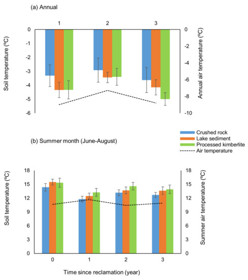 The lack of overall mean soil temperature differences among substrates and slightly higher soil temperatures during the growing season in processed kimberlite were similar in other studies [8,23]. The higher temperature in processed kimberlite substrate would be due to soil colour, texture, and chemical properties. Generally, processed kimberlite substrate is dark in colour, similar to black sand, therefore absorbing more latent heat than light coloured soils [8,23,33]. Soil texture is another contributing factor, as gravel substrates have higher porosity, resulting in surface pores being filled with air rather than water; thus, soil temperature remains lower as air is a poor heat conductor.