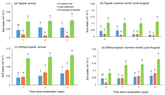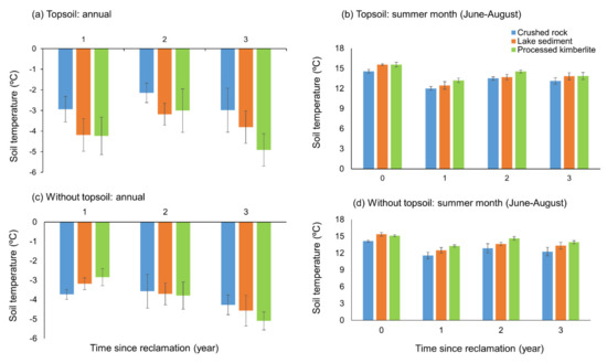 In the absence of interaction effects (amendments × year), treatments and years were separately analyzed. Only water content differed significantly with and without topsoil (annual mean p = 0.010; summer month mean p = 0.004), with no significant differences found for temperature. Annual and summer month water contents were greater without topsoil than with it (Figure 6), with a slightly increasing trend with time; no such trends were observed for temperature (Figure 7). In most cases, processed kimberlite substrate had greater water content and lower temperature for both annual and summer months (Figure 6 and Figure 7), whereas crushed rock substrate without topsoil had the lowest water content and temperature (Figure 6c,d, and Figure 7c,d).