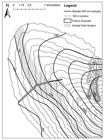 The dominant crop cultivated in the LKFS was ‘uala (sweet potato; Ipomea batatas), likely due to its tolerance to limited moisture conditions [5,7,8] and, arguably, the relatively late introduction of the sweet potato to Hawai’i spurred the expansion of rainfed agriculture in these drier, leeward areas [9]. However, land productivity was, and is, governed by temporal and spatial climatic variability. A critical driver is the intermittent rainfall on both intra- and inter-annual timescales that would have limited tuber production both directly through water limitation and indirectly through water-mediated nutrient availability [5,6,10,11,12]. To mitigate water limitation, indigenous Hawaiians developed place-specific methods to manage soil moisture during cropping seasons [13]. These included the use of rock and vegetative mulch, mounds, construction of berms, and establishment of sugar cane windbreaks/mist traps [3,14,15].