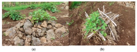 A randomized complete block design with three replicates was established at each of the three sites to evaluate three indigenous soil moisture conservation practices relative to two controls. A fourth block was integrated for destructive sampling in the mid-cropping season (60 days after planting). Each treatment was allocated to a soil mound 1 m in diameter, and separated from its nearest neighbor by 1 m. Treatments included (1) bare soil; (2) bare soil with irrigation; (3) rock mulch; (4) sugar cane leaf mulch; and (5) rock mulch over sugar cane mulch (Table 1, Figure 2). For the irrigation treatment, application rates represented the difference between the optimum and actual weekly rainfall levels using real-time rainfall data from weather stations in each plot [26]. Within each treatment mound, the heirloom Hawaiian variety “Lanikeha” was cultivated as a traditional cultivar preserved within the local community. The 40 cm terminal vine cuttings, collected onsite, were prepared by removing all leaves, excluding that from the terminal bud. Rooting was induced under sterile moisture for 3 days. Three slips were planted 10 cm apart and 20 cm deep in each mound.