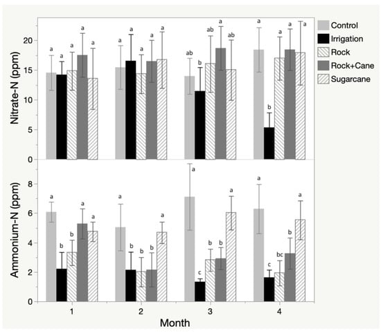 Nitrate and ammonium accumulation in the field experiment as measured by monthly soil samples, with letters representing significance using a Tukey HSD test.