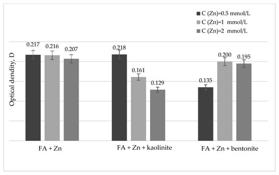 In three-component systems, including FA, trace element ion, and clay mineral complex processes occur, including the formation of complexes and salts and their adsorption. The adsorption of colored compounds of FA with Pb on the surface of kaolinite and bentonite increases with increasing metal concentrations. The adsorption of compounds of FA with Zn is more complex. At Zn concentration of 0.5 mmol/L adsorption of the FA–metal compounds take place. At metal concentrations of 1 mmol/L and 2 mmol/L, based on the absence of optical density changes, we can formally assume the absence of FA–metal salt and complex adsorption by bentonite.