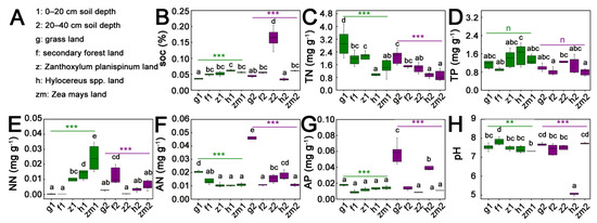Effect of the different land use types on soil nutrients in 0–20 cm and 20–40 cm soil depth. (A) Description of abbreviations, (B) SOC content, (C) TN content, (D) TP content, (E) NN content, (F) AN content, (G) AP content, (H) pH. The different letters are significantly different with ANOVA followed by Duncan’s multiple range test at the level of p < 0.05. ** and *** above green line and purple line indicate obvious difference at p < 0.01 and p < 0.001 at 0–20 cm and 20–40 cm soil depths, respectively.
