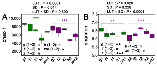 Effect of the different types of land use on soil bacterial alpha diversity: (A) Chao1, (B) Shannon. ** and *** above green line and purple line indicate obvious difference at p < 0.01 and p < 0.001 at 0–20 cm and 20–40 cm soil depths, respectively, in the five different land use types (ANOVA); n is not statistically significantly different among the five different land use types (ANOVA). *, ** and *** after g/f/z/h/zm (1–2) indicate obvious difference at p < 0.05, p < 0.01 and p < 0.001 between 0–20 cm and 20–40 cm soil depth in the five different land use types, respectively (independent t-test), n is not statistically significantly different between 0–20 cm soil depth and 20–40 cm soil depth in the five different land use types, respectively (independent t-test). Results of two-way ANOVA for the effects of land use types (LUT) and soil depth (SD) on Chao1 and Shannon. g1: grass land at 0–20 cm; g2: grass land at 20–40 cm; f1: secondary forest land at 0–20 cm; f2: secondary forest land at 20–40 cm; z1: Zanthoxylum planispinum land at 0–20 cm; z2: Zanthoxylum planispinum land at 20–40 cm; h1: Hylocereus spp. land at 0–20 cm; h2: Hylocereus spp. land at 20–40 cm; zm1: Zea mays land at 0–20 cm; zm2: Zea mays land at 0–20 cm.