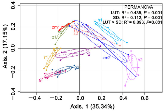 Principal coordinate analysis (PCoA) of soil bacterial communities (Bray–Curtis) for all soil samples. g1: grass land at 0–20 cm; g2: grass land at 20–40 cm; f1: secondary forest land at 0–20 cm; f2: secondary forest land at 20–40 cm; z1: Zanthoxylum planispinum land at 0–20 cm; z2: Zanthoxylum planispinum land at 20–40 cm; h1: Hylocereus spp. land at 0–20 cm; h2: Hylocereus spp. land at 20–40 cm; zm1: Zea mays land at 0–20 cm; zm2: Zea mays land at 0–20 cm.