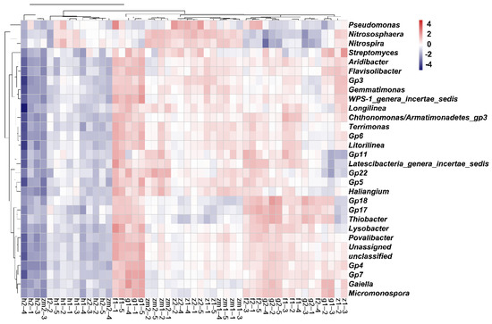 The results of the PCoA (calculated on Bray–Curtis) showed that PCoA1 and PCoA2 explained 35.34% and 17.15% of the total variation in the bacterial communities at 0–20 cm and 20–40 cm across the five land use types. Further, the 0–20 cm and 20–40 cm depths were clearly separate across the land use types. Furthermore, the five land use types were able to significantly separate at 0–20 cm and 20–40 cm depths (Figure 4). In addition, land use type (LUT), soil depth (SD), and the interaction between them exerted a significant (p = 0.001) influence on the composition of the bacterial community (Figure 4). At the genus level, the heatmap demonstrated that the clustering pattern of the bacterial communities at depths of 0–20 cm and 20–40 cm was similar to those observed by PCoA (Figure 5). The majority of the top 30 genera at the 0–20 cm depth in grassland and forest demonstrated a higher absolute abundance compared to those of the other land use types (Figure 5). The genera of the bacterial communities of Hylocereus spp. at the 0–20 cm soil depth were lowest among the five different land use types (Figure 5). In addition, most of the top 30 genera at the 20–40 cm depth in grassland and Zanthoxylum planispinum demonstrated a significantly higher absolute abundance, as shown by the greater number of red columns compared with the other three different land use types (Figure 5). Most of the top 30 genera at the 20–40 cm depth in Hylocereus spp. demonstrated a significantly lower absolute abundance (Figure 5). In addition, our results showed that the five different land use types featured the same 1149 OTUs at 0–20 cm and the same 1103 OTUs at 20–40 cm; however, grass land, Zanthoxylum planispinum land, and Zea mays land presented no special OTU at the two soil depths (Supplementary Materials, Figure S2).