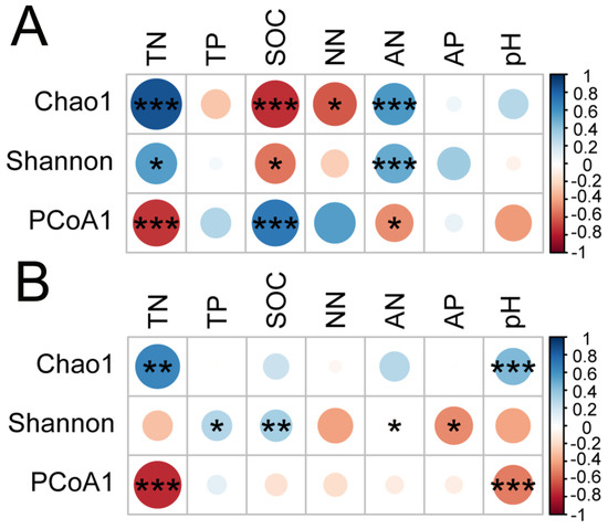 Spearman’s rank correlation coefficients between soil properties and microbial varieties (Chao1 and Shannon index; PCoA) at 0–20 cm soil depth (A) and 20–40 cm soil depth (B), respectively. *, ** and *** indicate obvious difference at p < 0.05, p < 0.01 and p < 0.001 between soil properties and microbial Chao1, Shannon index; PCoA.