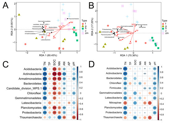 Ranking diagram of the redundancy analysis (RDA) to identify the relationship between soil nutrients (red arrows) and the richness of soil microbial phyla (black dots) at 0–20 cm soil depth (A) and 20–40 cm soil depth (B), respectively; Spearman rank correlation coefficients between soil nutrients and the abundance of soil microbial phyla at 0–20 cm soil depth (C) and 20–40 cm soil depth (D), respectively. *, ** and *** indicate obvious difference at p < 0.05, p < 0.01 and p < 0.001 between soil nutrients and the abundance of soil microbial phyla.