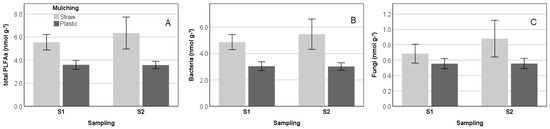 Abundance of PLFA biomarkers in soil samples differentiated by mulching system (Straw vs. Plastic) and sampling date: April (S1) and May (S2). Graphic (A): Corresponds to total PLFAs, (B): Soil fungi, and (C): Soil bacteria.