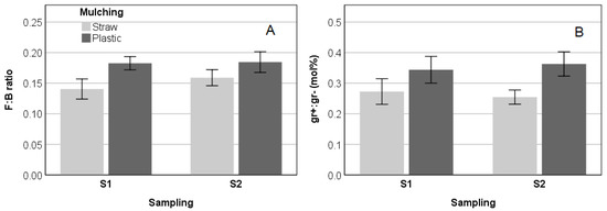 Structure of soil microbial communities as determined by PLFA analysis differentiated by mulching system (straw vs. plastic mulching) and sampling date: April (S1) and May (S2). (A): Molar % ratio of fungi to bacteria (F:B); (B): Molar % ratio Gram-positive to Gram-negative bacteria (gr+:gr−).