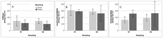 Soil chitinase (A), leucine aminopeptidase (B), and acid phosphatase (C) activity differentiated by mulching system (straw vs. plastic mulching) and sampling day (S1 & S2).