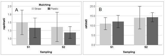 Relative ratios of the genes involved in denitrification potential of the studied plots, differentiated by mulching system (straw vs. plastic mulching) and sampling day (S1 & S2). (A): napA:narG, and (B): nirK:nirS.