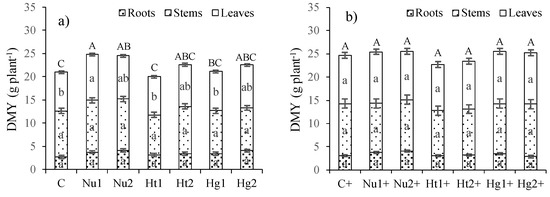Dry matter yield (DMY) in roots, stems, leaves and total in response to the application of organic amendments (C, Control; Nu, Nutrimais; Ht, Humitec; and Hg, Humic gold, applied at two rates (1,2)) in experiments (a) without and (b) with NPK(+) mineral fertilization. Lowercase letters show the results of analysis of variance and means separation (Tukey HSD, α = 0.05) for each plant part and uppercase letters for total DMY.