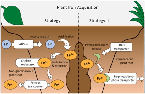 Diagram of the two iron (Fe) acquisition strategies employed by plants: orange ellipses show the chemical form of Fe, blue circles represent hydrogen (H+) ions, white boxes with arrows indicate molecule transport points into/out of the root, and numbers indicate individual steps of the process (based on [29,42,43]).