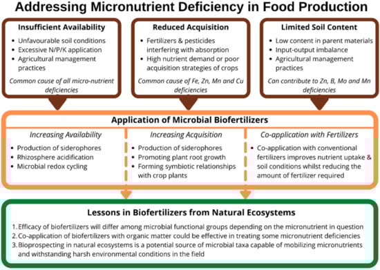 Numerous environmental factors and intensive agricultural practices can contribute to low micronutrient availability in arable soils, but biofertilizers offer an effective and sustainable way of fortifying crops with micronutrients to improve growth and yield, as well as alleviating hidden hunger in the global human population (Figure 2). Inorganic fertilizers can be costly, unsustainable, and often ineffective, but microorganisms capable of increasing micronutrient acquisition by plants can be used to produce biofertilizers and fortify food crops. By synthesizing the literature, we drew three key conclusions to guide future research and the refinement of biofertilizers (Figure 2):