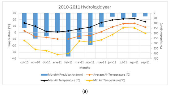 The monthly average precipitation and temperature distribution (Figure 1) in the 2010–2011 hydrologic year were characterized by temperatures ranging from −33.5 °C to 21.7 °C (0.6 °C average) and annual total precipitation of 2128 mm. The 2011–2012 hydrologic year was warmer and with less precipitation than 2010–2011. The temperature ranged from −23.24 °C to 23.39 °C (2.25 °C average) and annual total precipitation was 989 mm.