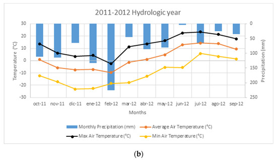 Monthly precipitation (mm) and monthly average, min, and max air temperature (°C) for both hydrologic years 2010–2011 ((a), upper plot) and 2010–2012 ((b), lower plot).