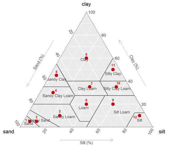 The model profile configuration holds 81 nodes ranging from 0.01 to 10.0 m deep. The van Genuchten–Mualem (vG) parameterization model was used to calculate the vG parameters for 12 soils (Figure 2 and Table 1). The ideal soils represent the basic 12 soil textures: sandy, loamy sand, sandy clay loam, sandy loam, sandy clay, loam, clay loam, clay, silty loam, silty clay loam, silty clay, and silt. The vG parameters were extracted using the Pedotransfer Function ROSETTA [49] and soil textures (sand, clay, and silt %) as input. Each texture was chosen randomly but setting up the criteria to be closer to the center of the soil type in the USDA soil triangle (red stars in Figure 2). It should be noted that at the model soil profile, the first 0.6 m of soil comprises layers 1 to 60 (0.01 m each), while the final (bottom) describes the remaining 9.4 m (node 61 to 81).