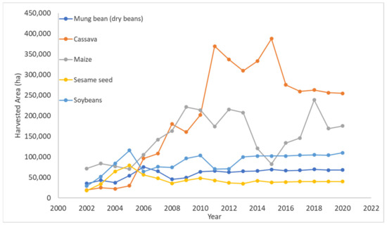 Harvested areas of non-rice crops in Cambodia from 2002 to 2020 (FAOSTAT, 2022 [17]).