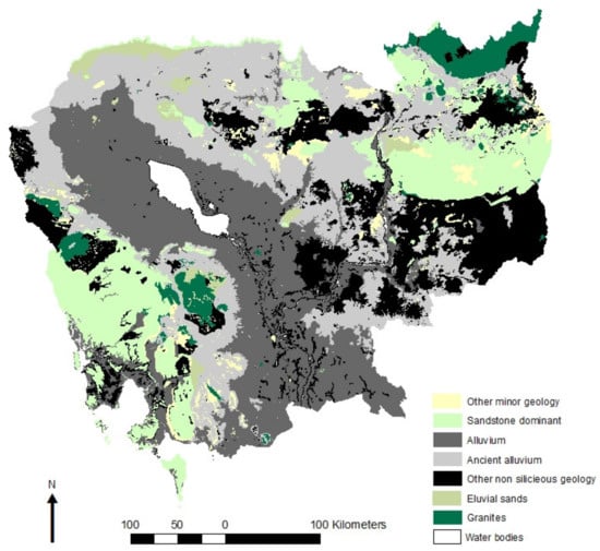 Sedimentary formations underlie much of Cambodia and the Khorat Plateau in NET, which also extends into Southern and Central Laos. The sediments are predominantly Mesozoic sandstone in Cambodia [25] (see Figure 2) and Cretaceous sandstone under the Khorat Plateau [26]. The sandstone and its weathering products have a dominating influence on the properties of upland soils in the region. While lowland soils are derived from alluvial, colluvial and lacustrine sediments, these are also frequently sandy materials [12,24]. In Cambodia, 39% of the lowland rice soils that have sandy surface horizons are mostly derived from the weathering and erosional products of sandstone [12].