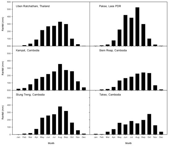 Average monthly rainfall for Takeo, Siem Reap, Stung Treng and Kampot in Cambodia Pakse in Laos PDR, and Ubon Ratchathani in Thailand. Data for Thailand, Lao PDR, and Siem Reap, Kampot and Stung Treng sourced from CLIMWAT data [47]; Takeo, Cambodia—data sourced from Bureau of Meteorology (40 years).