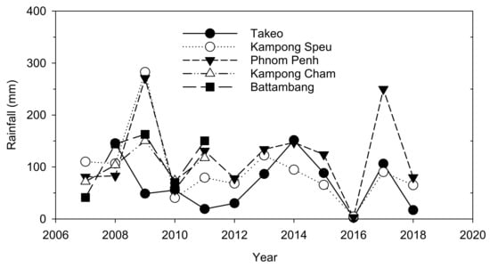 For most of Cambodia, mean annual rainfall ranges from 1250 to 1750 mm (e.g., Figure 3 and Figure 4) but it increases up to 2500 mm in the south, (e.g., Kampot; Figure 3 and Figure 4), and even higher in the highlands in the east of the country [43,44]. Tsujimoto et al. [44] analyzed the distribution of annual rainfall throughout the year and concluded that 8–20% occurs in the pre-monsoon periods, 50–80% occurs in the monsoon period and 12–36% occurs in the post-monsoon period. However, there were regional differences in rainfall distribution both annually and diurnally. The variations in average annual rainfall, the average start and end date of the rainy season and its reliability have consequences for cropping patterns, and define options for pre-rice and post-rice cropping choices, especially on sands with limited soil–water storage.
