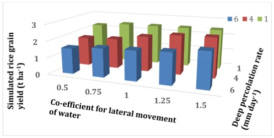 Simulated grain yield (t ha-1) for rice cv. KDML105 under different degrees of lateral movement of water (CL) and deep percolation rates (mm day-1) at Ubon Ratchatani, NE Thailand. [65]. CL < 1 indicates net runoff, CL = 0 indicates no lateral water flows and CL > 1 indicates net run-on of water.